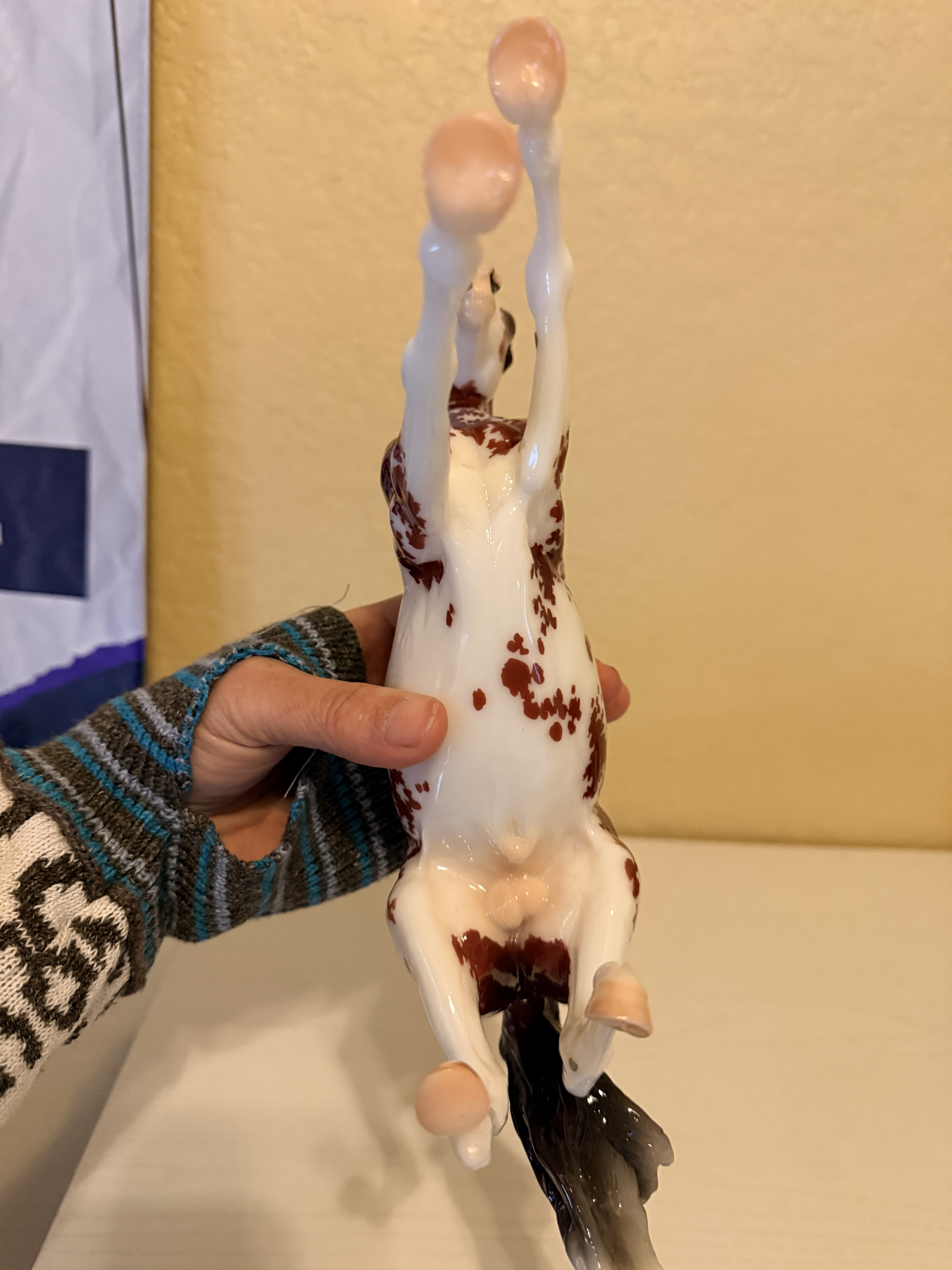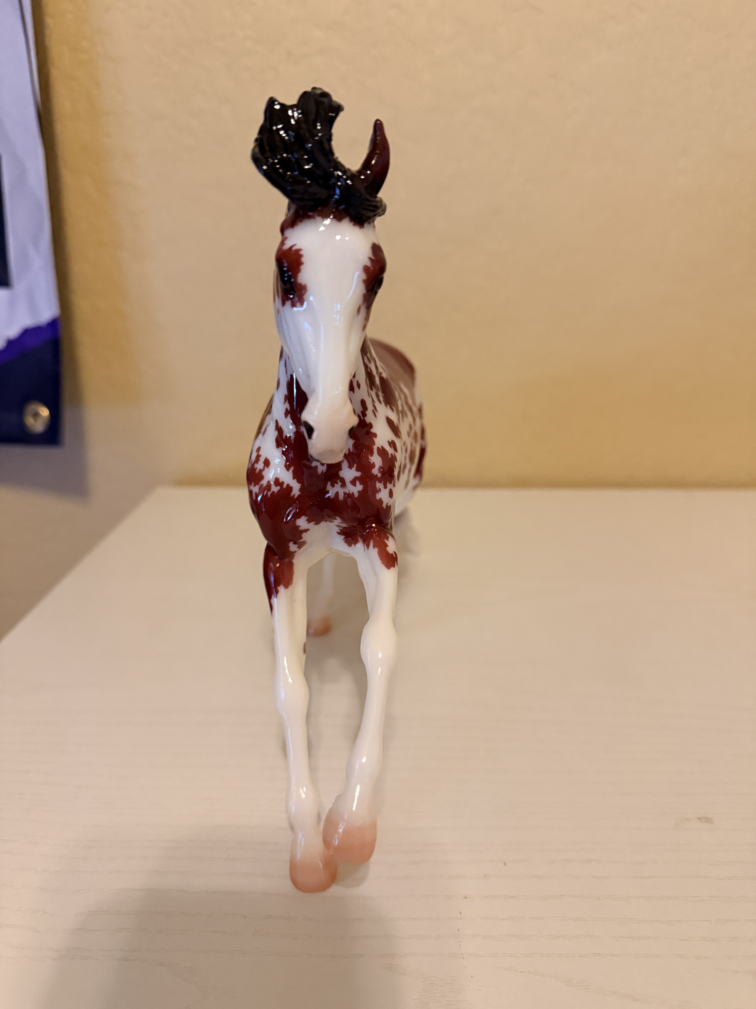 Lovely Darjeeling - Glossy bay semi-leopard with brown and black spots, star, snip, black and white mane, black tail with white tip, black lower legs, off hind sock. Small rub on left knee. Stamped "Breyerfest 2017" in gold on belly.