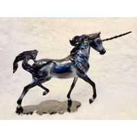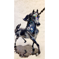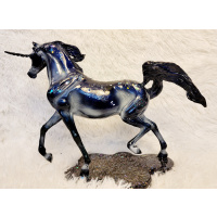 I’ve repainted this Breyer Smarty Jones to a rich dark bay. His logos and seams have been sanded down and his air hole has been filled and moved to his groin area. He was created using pastels, acrylics, and pencils. He has a star and two socks. His mane and tail have highlights in them so they’re not just flat black. His hooves are detailed on the outside and the bottoms (with the exception of the hoof with the peg, just the outside is done there). His eyes, hooves, and inner nostrils are g...